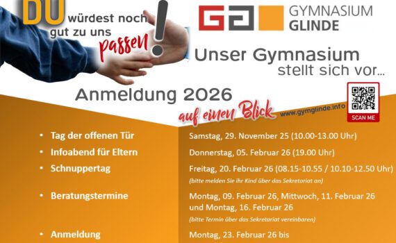Ihr Kind möchte auf unsere Schule wechseln, oder Du selbst überlegst, an das Gymnasium Glinde zu kommen? Dann ist unser Tag der offenen Tür eine gute Chance, unsere Schule kennenzulernen! Wir öffnen die Türen unseres Gymnasiums am Samstag, den 29.11.2025 von 10 bis 13 Uhr. Es wird Stände für die verschiedenen Angebote und Fächer an unser Schule geben. Schülerinnen und Schüler führen durch das Gebäude und präsentieren unsere Räumlichkeiten, es gibt die Möglichkeit, in Unterrichtsstunden reinzuschnuppern und vieles mehr. Neben […]