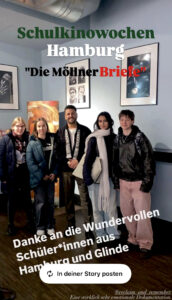 Die Klassen 9c und die 9d waren am Montag mit Herrn Hatip und Frau Mahncke-Wachter bei den SchulKinoWochen in Hamburg und sie haben einen Dokumentarfilm über die fremdenfeindlichen Anschläge in Mölln 1992 gesehen. Die Möllner Anschläge waren rassistisch motivierte Brandanschläge, bei denen Bahide Arslan, ihre zehnjährige Enkelin Yeliz Arslan und die 14-jährige Ayşe Yılmaz starben; die von rechtsextremer Gewalt motivierten Anschläge wurden in den Medien breit diskutiert, mit weitreichenden Folgen und einer späten Initiative durch mitfühlende Briefe an die Hinterbliebenen. Beeindruckend war nach dem Kinobesuch das Nachgespräch mit „Ibo“ Arslan, einem Überlebenden der rassistischen Brandanschläge. Er hat sich den Fragen der Schülerinnen und Schüler gestellt und dann noch ein Gruppenfoto von sich mit den Schülern machen lassen.