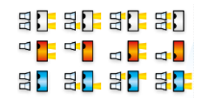 Es gibt drei unterschiedliche Bausteine, die jeweils anders auf eingehendes Licht reagieren. Der blaue Baustein gibt immer genau das eingehende Licht weiter, der rote macht nur Licht, wenn keins auf die Sensoren trifft, und der weiße Baustein sendet immer Licht, außer wenn beide Sensoren mit Licht angestrahlt werden.