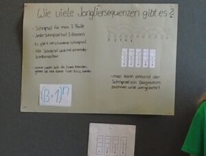 Dann beschäftigten wir uns mit der Frage, wie viele Jongliermuster es gibt. Dazu erarbeiteten wir verschiedene Plakate.