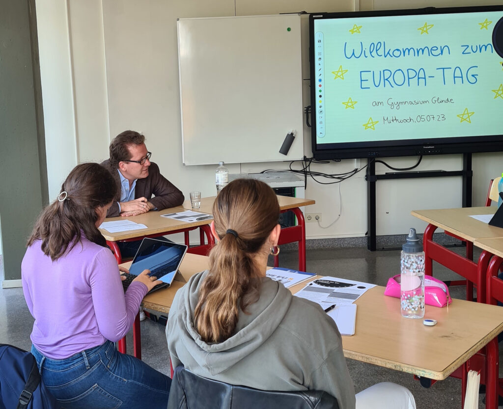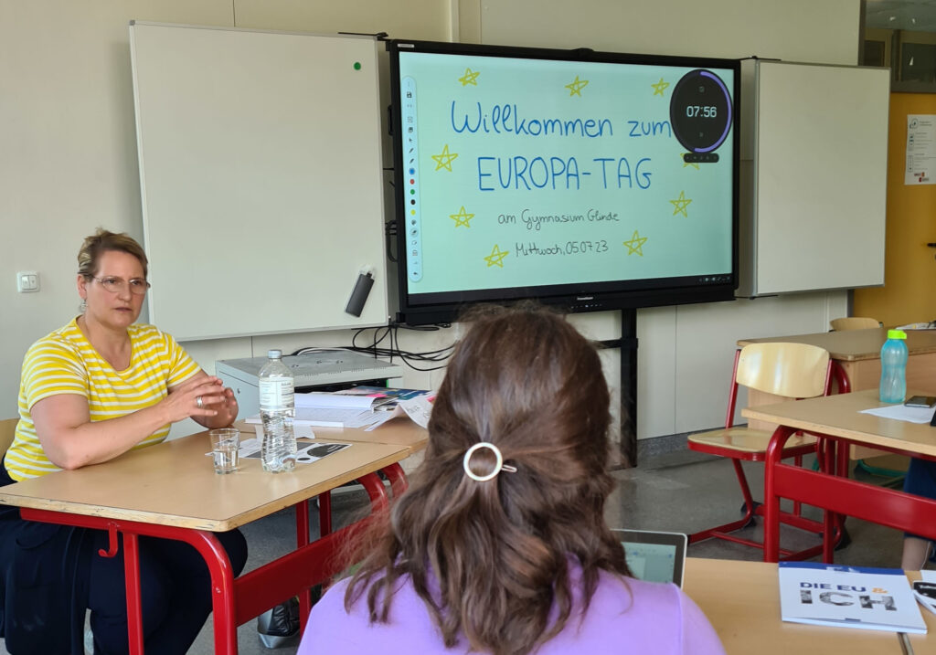 Am Mittwoch, den 05.07.2023 gab es für die Jahrgangsstufe QI den Europa-Projekttag, an dem die Schülerinnen und Schüler einen Einblick in die europäische Politik erlangten. An unterschiedlichen Projekttischen haben sie sich im Dialog mit geladenen Gäste aus der Lokalpolitik mit den Themenbereichen der Sicherheits-, Klima-, Digital- und Justizpolitik auseinandergesetzt, welche im Voraus von den Schülerinnen und Schülern des Wipo-Profils vorbereitet wurden.