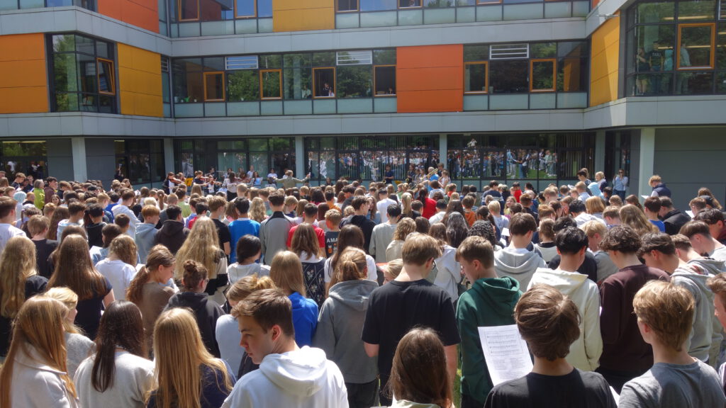 Schülerinnen und Schüler vom Gymnasium Glinde haben sich auf der Wiese vor der Schule versammelt, um gemeinsam die Europa Hymne zu singen, zu musizieren und für Demokratie und Vielfalt ein Zeichen zu setzen. Mehr dazu hier.