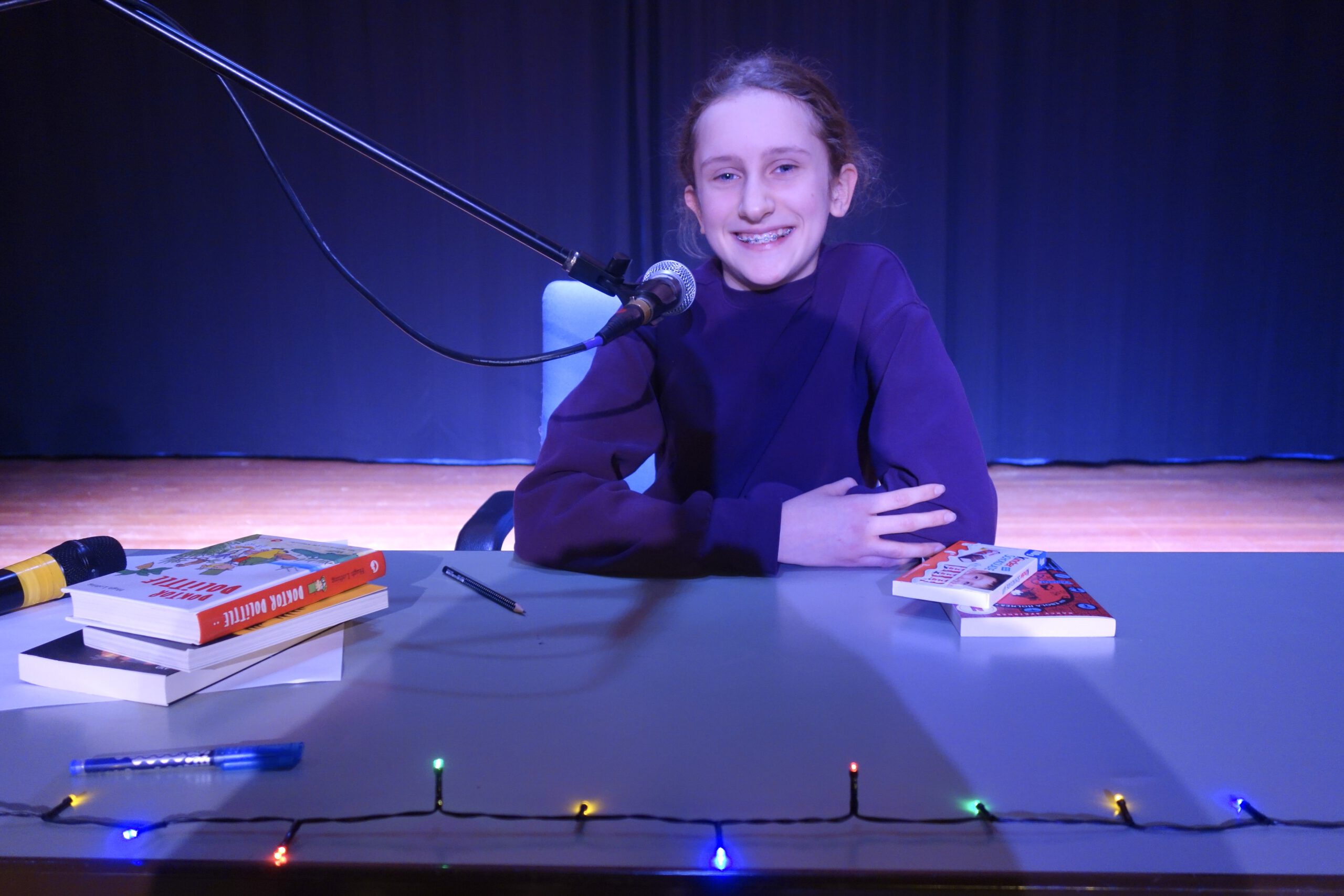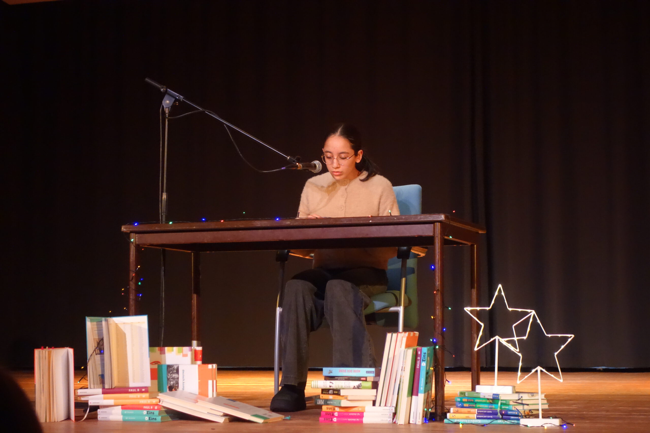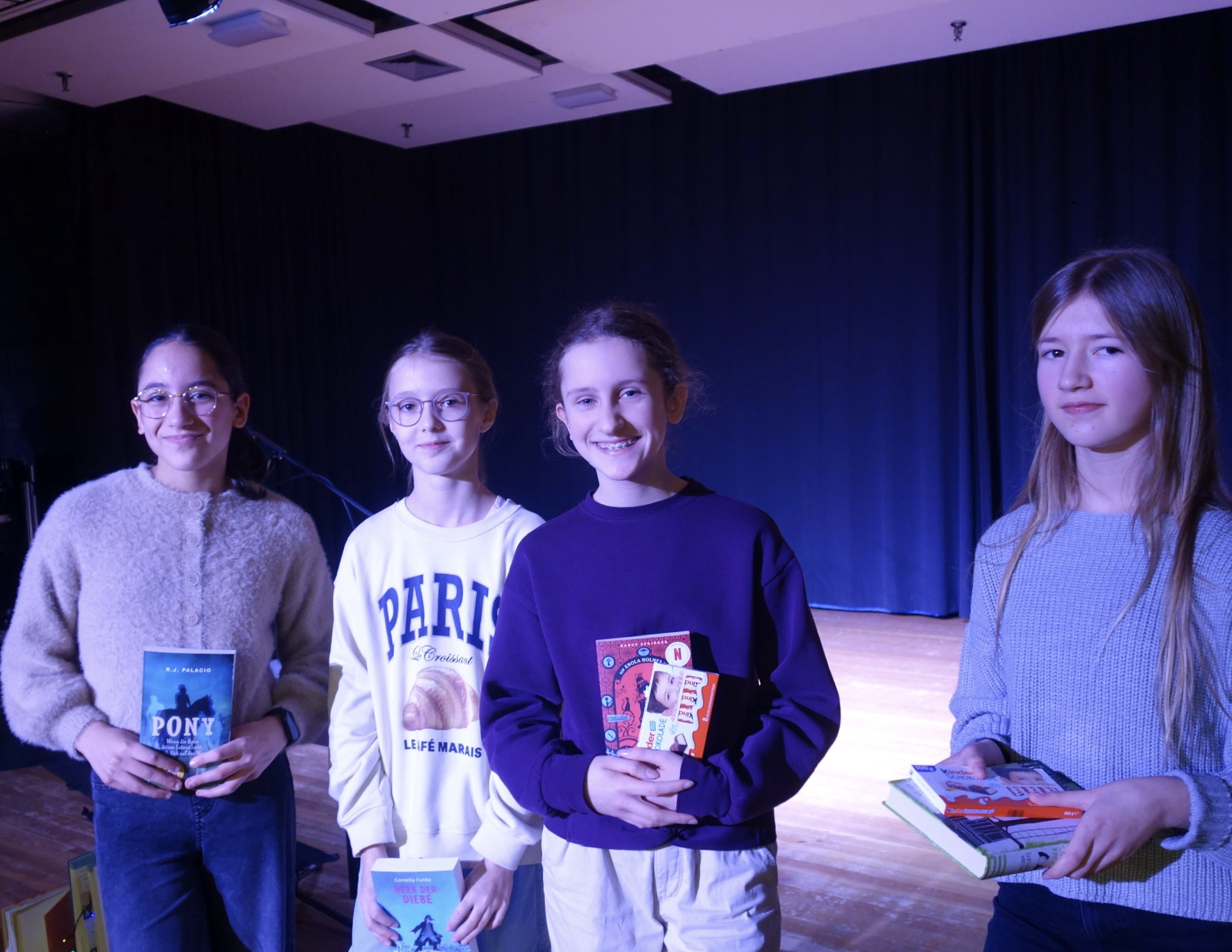 Trotz Aufregung lasen die Klassensieger der sechsten Klassen aus ihren selbst ausgewählten Büchern vor, während das Publikum aufmerksam zuhörte. Nachdem alle vorgelesen hatten, ging es für Leni, Vera, Paula und Emilia ins Finale, indem sie einen kurzen Ausschnitt aus dem Buch ,,Doktor Dolittle“ vorlasen. Nach einer kurzen Besprechung der Jury, bestehend aus Frau Staeck, Frau Jungjohann und einer Schülerin aus der Oberstufe, wurde die Siegerin verkündet. Vera Lebsack aus der 6b gewann den diesjährigen Vorlesewettbewerb und durfte sich ein Buch ihrer Wahl aussuchen. Damit die anderen Finalistinnen nicht traurig sind, teilten sie sich in diesem Jahr den 2. Platz. Auch sie durften sich ein Buch aussuchen und bekamen einen kräftigen Applaus.