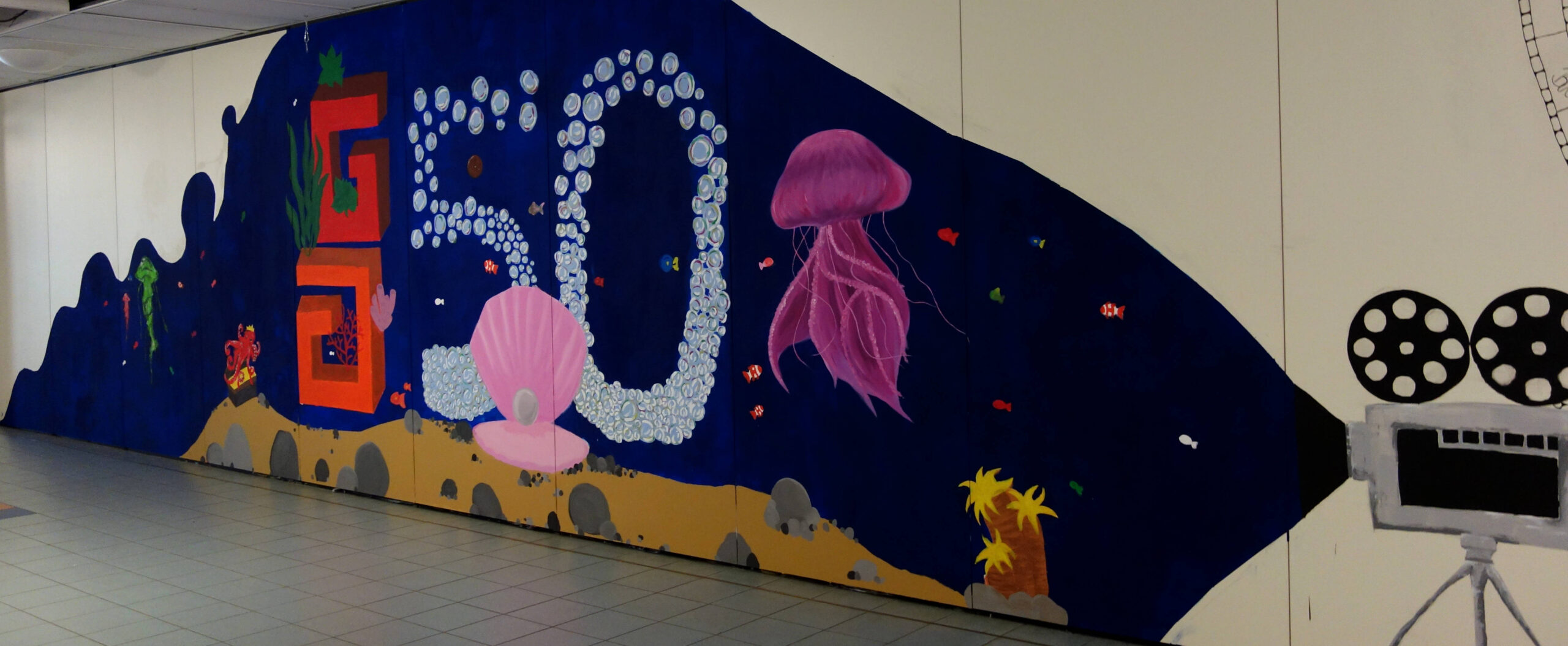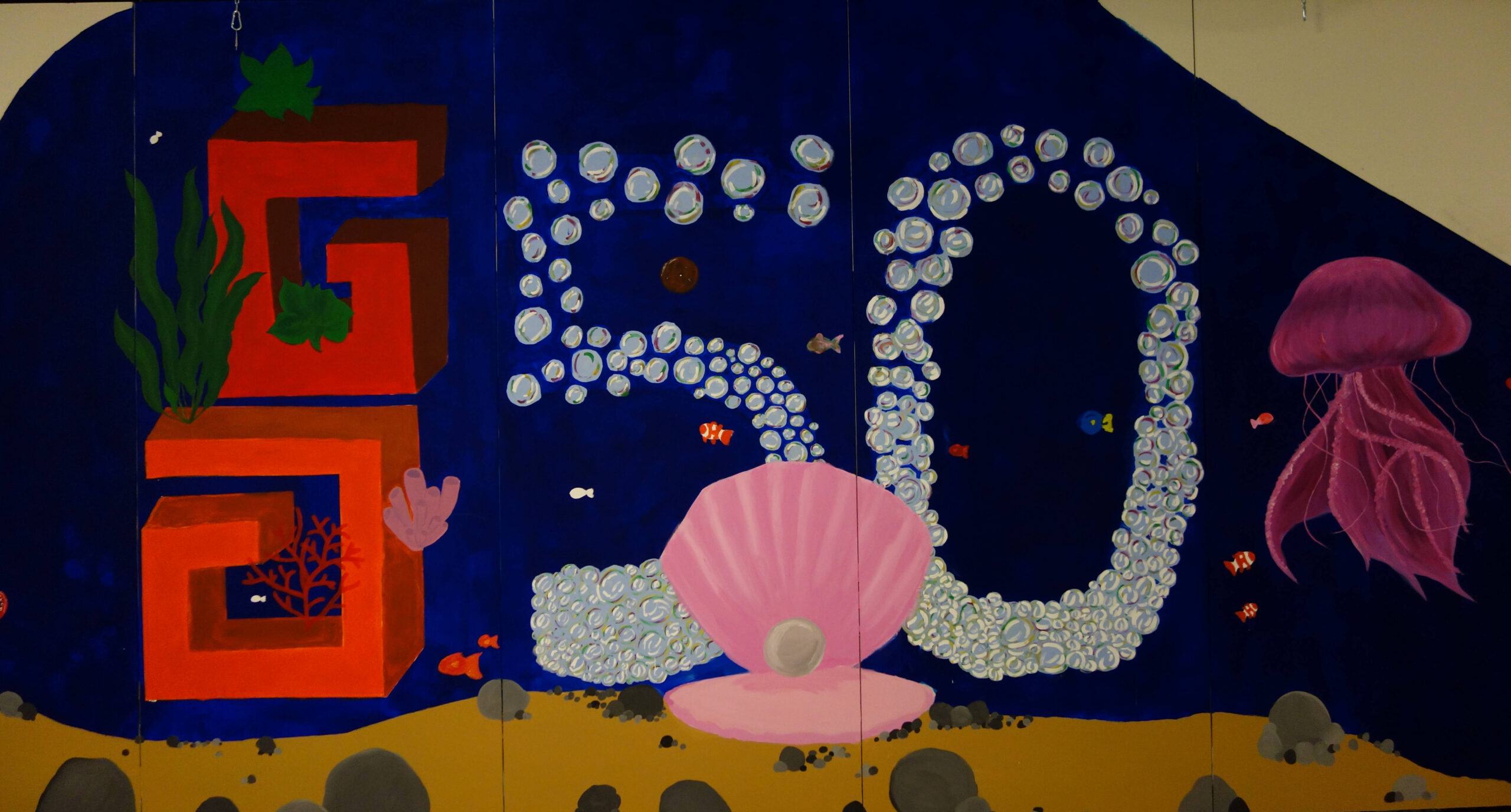 Links hat der zehnte Jahrgang die Zahl „50″ aus Blasen und Quallen gestaltet. Ich hatte ihnen anfangs gesagt, dass es nicht nur um die vergangenen