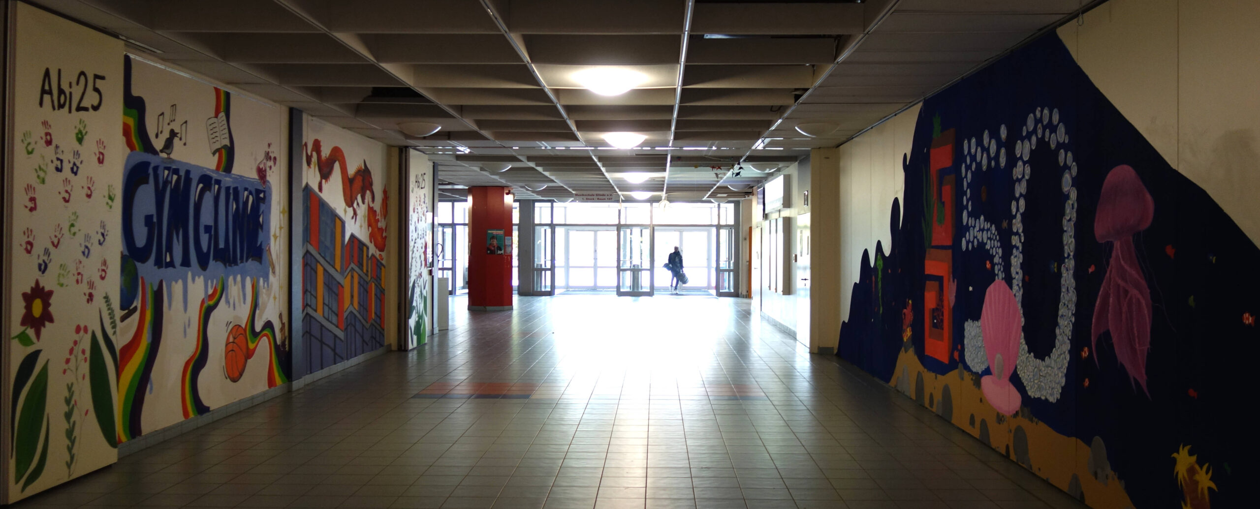 Ja, definitiv. Auf der rechten Seite, wenn man vom Eingang Ost kommt, hat die Q2 ein Bild des Schulgebäudes mit einem Drachen darüber, einer Weltkugel und weiteren Details gestaltet. Sie haben sich stark auf die Schule und das Gebäude bezogen, aber dabei Raum für Interpretationen gelassen. Der Drache zum Beispiel – da kann jeder seine eigenen Assoziationen haben. Einige Schüler dachten, er könnte für Stärke, Entschlossenheit oder Fantasie stehen.