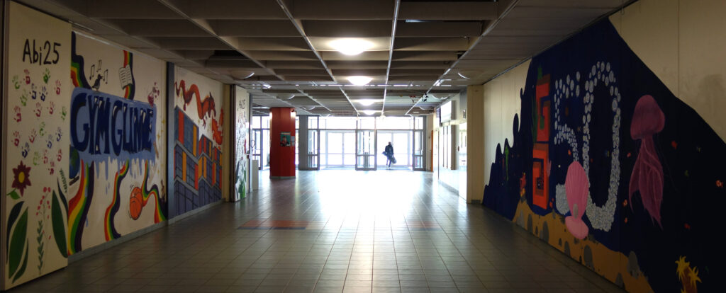 50gg mit den Abmessungen 2560 × 1376 in Neue Gestaltung der Schulstraße – Wandmalereien Bilder Navigation Zurück 50 Jubiläum Das Bild zeigt ein Unterwassermotiv , welches für die Zukunft auf Bezug mit dem Klimawandel zu assoziieren ist.
