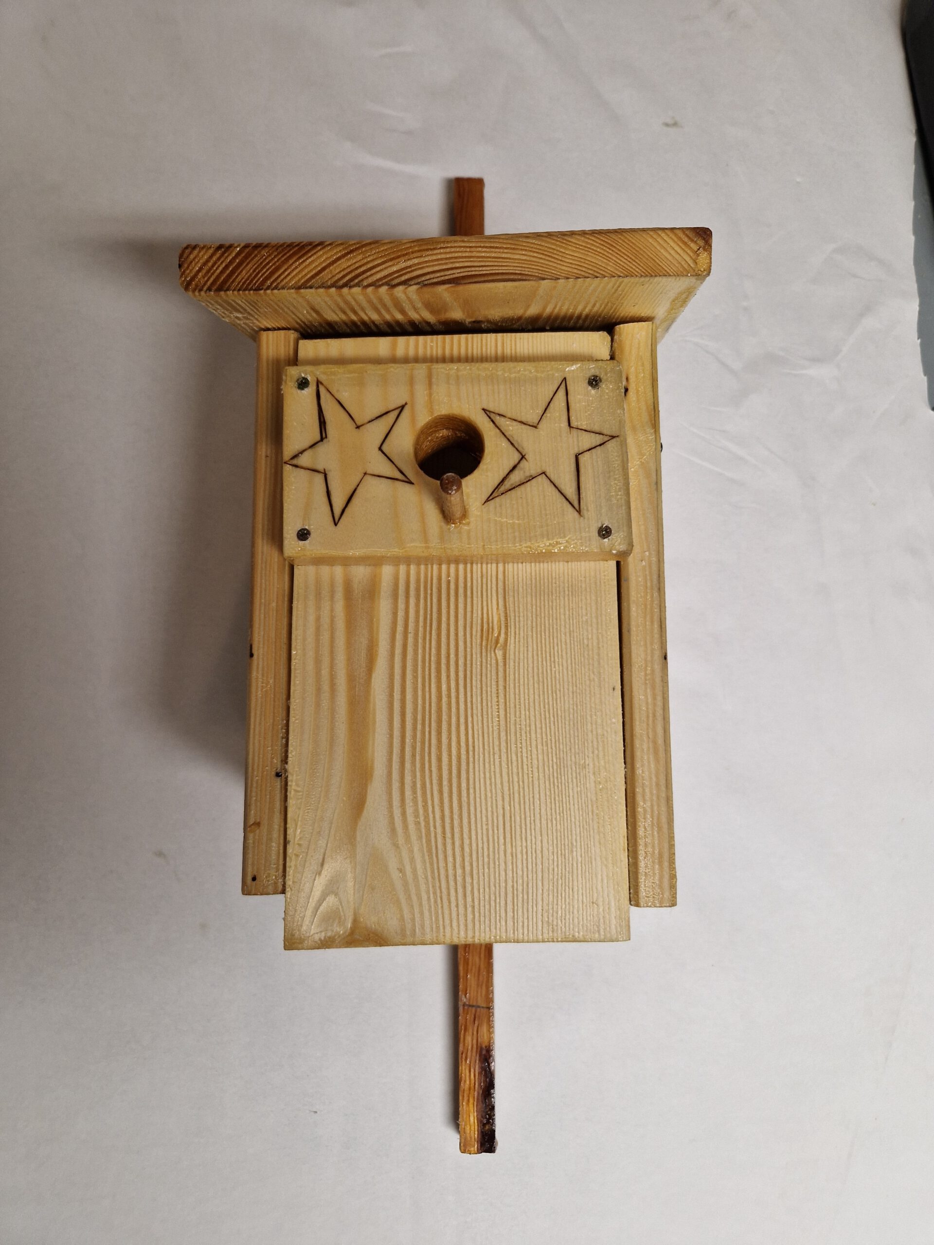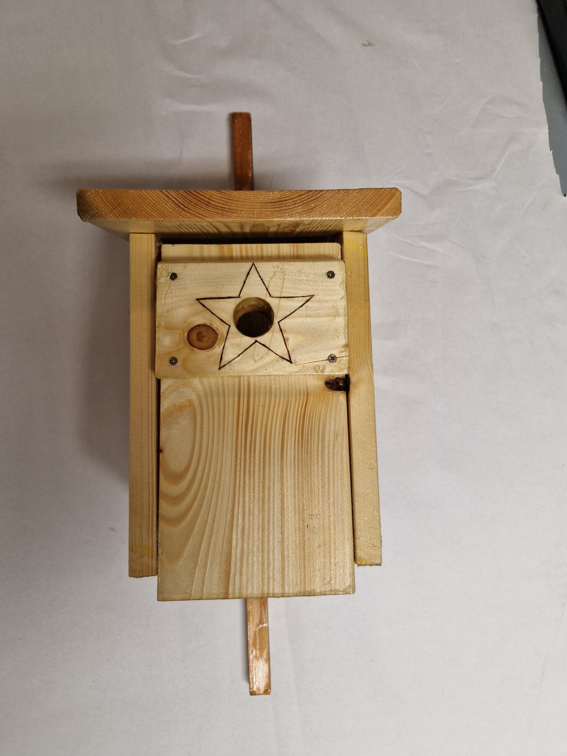 Da die Nistkästen jeden Spätsommer gereinigt werden müssen, habe ich eine Drehachse, die aus zwei Nägeln besteht (hierbei müssen Nägel genutzt werden), eingebaut. Diese ermöglicht das Öffnen der Front. An der Unterseite der Front sind zwei Haken angebracht, die verhindern, dass der Nistkasten ungewollt aufgeht.
