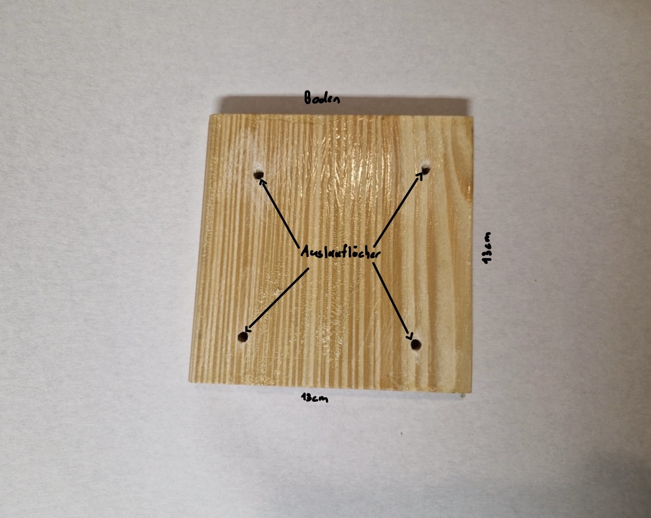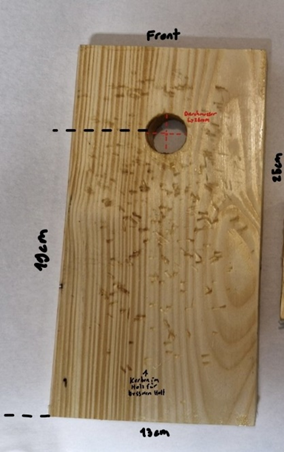 Beim Bau gab es jedoch noch einige Dinge zu beachten. Je nach Größe des Einfluglochs eignet sich der Nistkasten für verschiedene Arten von Höhlenbrütern. Für Blaumeisen sollte das Einflugloch einen Durchmesser von 26-28 mm haben, um zu verhindern, dass größere Vögel, die früher brüten, ihre Nistplätze beanspruchen. Außerdem sollte die Unterkante des Einfluglochs mindestens 14 cm vom Kastenboden entfernt sein, um den Nistkasten vor Mardern zu schützen. Meine Nistkästen haben beide einen Abstand von 19 cm. Zur zusätzlichen Sicherheit wird an der Vorderseite der Front auch ein Marderschutz angebracht.