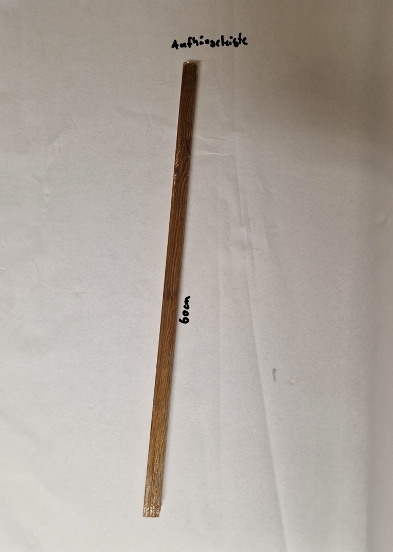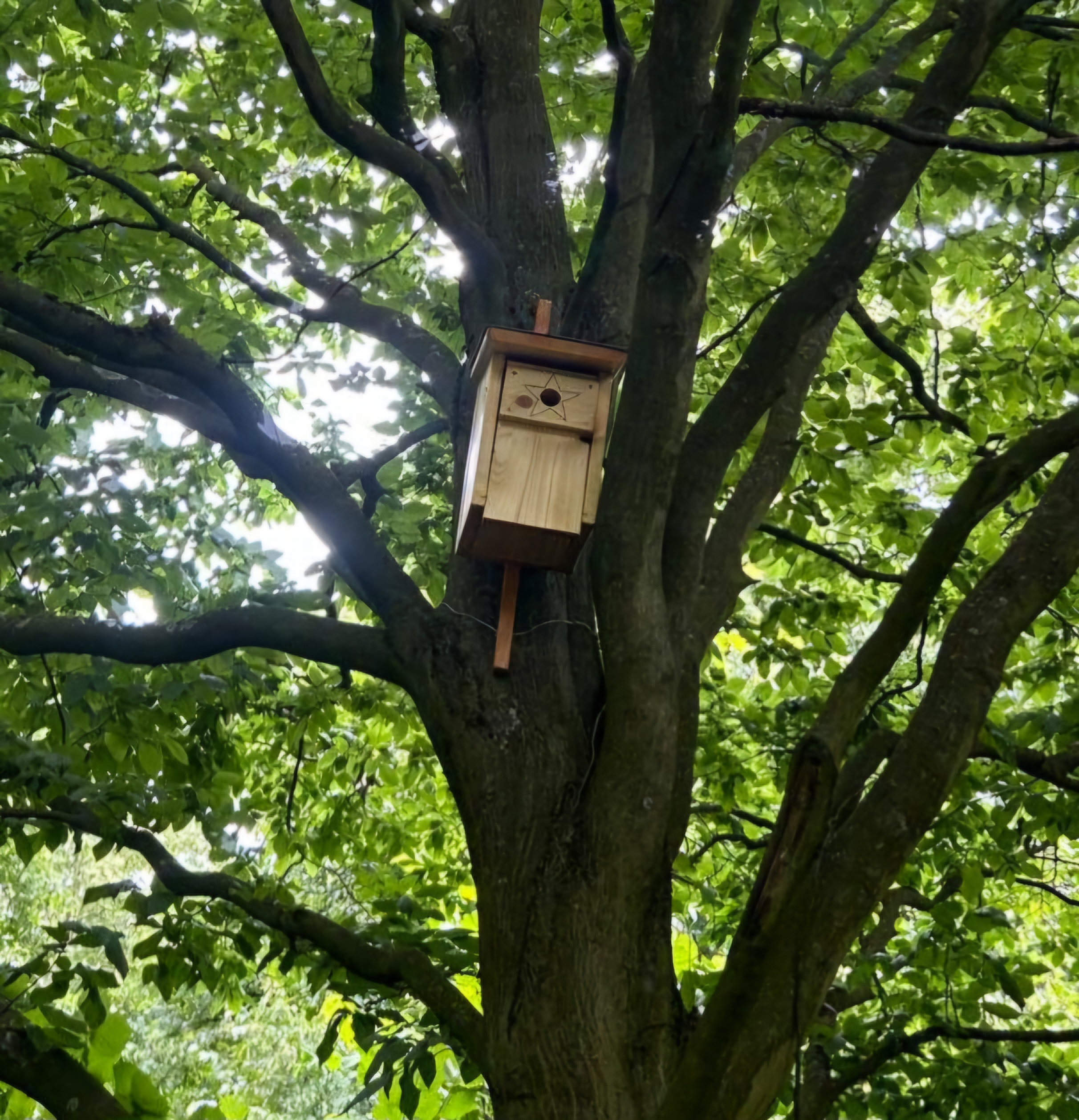 An der Innenseite der Front habe ich mit einem Schraubenzieher Kerben ins Holz gemacht, damit die Vögel besseren Halt haben. Diese Kerben sind besonders um das Einflugloch herum wichtig. In den Boden habe ich vier Löcher mit einem Durchmesser von fünf Millimetern gebohrt, um den Nistkasten zu belüften und zu entfeuchten. Zum Aufhängen habe ich eine 60 cm lange Leiste hinten am Nistkasten befestigt. In diese habe ich dann oben und unten kleine Löcher gebohrt, durch die ein Draht gefädelt wird, der dann zum Aufhängen genutzt wird. Beim Aufhängen sollte dem Baum möglichst kein Schaden zugefügt werden.