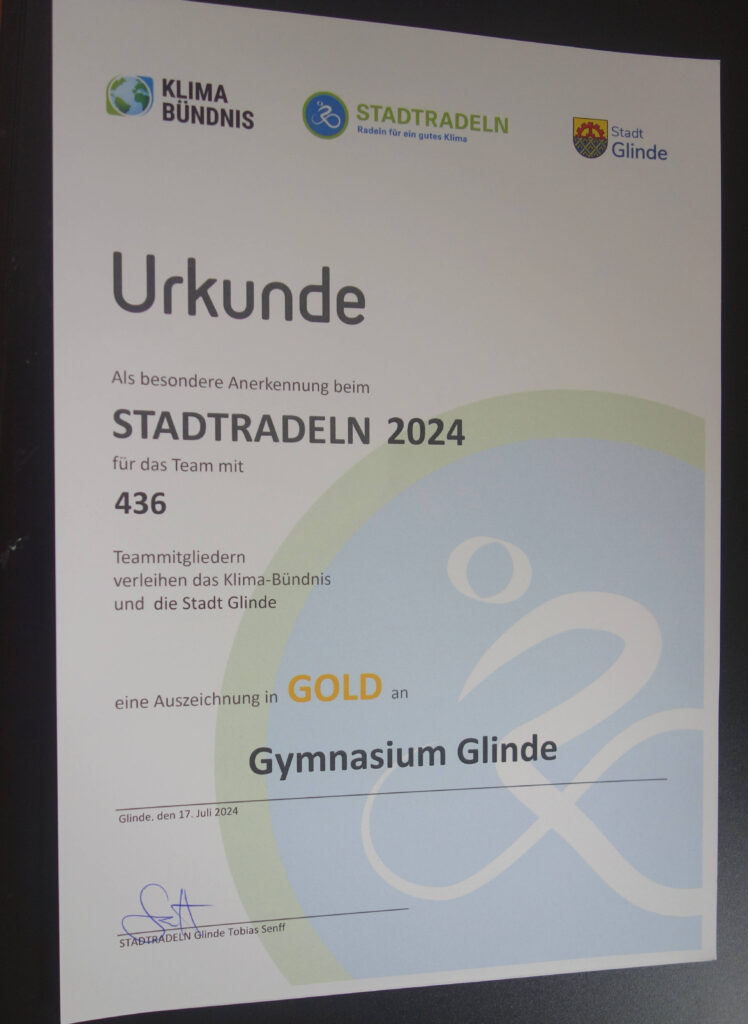 Das Gymnasium Glinde hat sich mit 23.980 gefahrenen Kilometern aller Beteiligten beim STADTRADELN 2024 einen ersten Platz in der Kommune erobert.