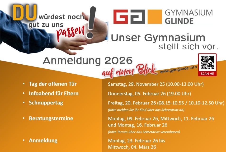 Ihr Kind möchte auf unsere Schule wechseln, oder Du selbst überlegst, an das Gymnasium Glinde zu kommen? Dann ist unser Tag der offenen Tür eine gute Chance, unsere Schule kennenzulernen!
