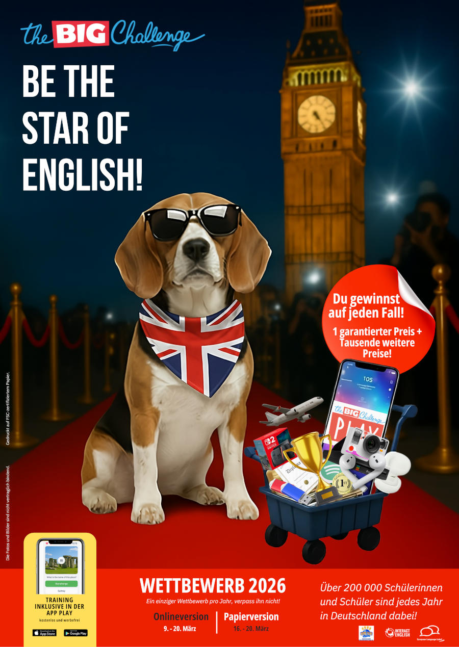 Alle Schüler des 5-7. Jahrgang stellen sich der Herausforderung und treten zum Big Challenge an! Sie sollen zeigen, wie gut ihre Englischkenntnisse sind, dabei Aufgaben zu Grammatik, Landeskunde, Aussprache und Textverständnis per Multiple-Choice beantworten. 45 Minuten heißt es „concentration“, und das bisher Gelernte richtig anwenden!