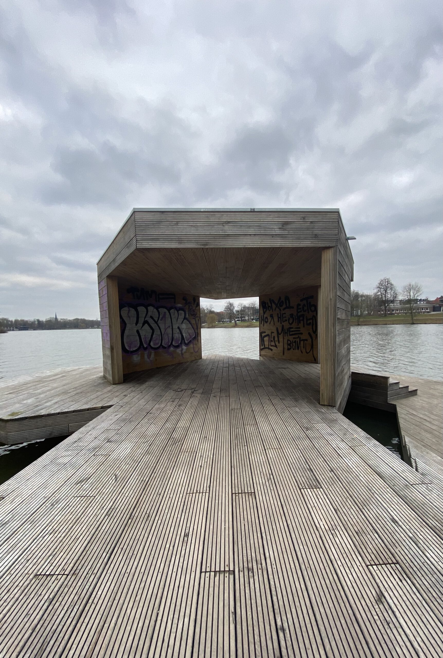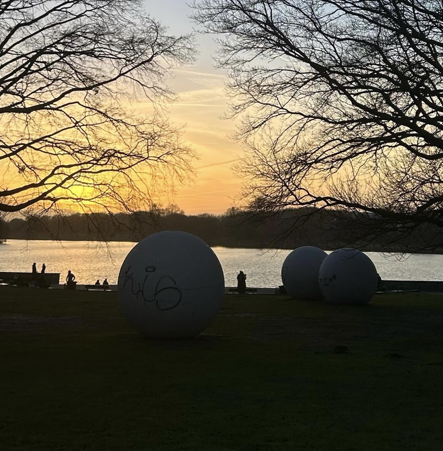 Am Tag der Anreise trafen wir uns um 10 Uhr mit allen am Hamburger Hauptbahnhof. Von dort aus brachte uns ein ICE in zwei Stunden nach Münster. Der Weg vom Bahnhof zur Jungendherberge schaffte uns einen ersten Eindruck von der Stadt. Viele Fahrräder, eine hübsche Altstadt, junge Menschen. Im Jugendgästehaus am Aasee angekommen ging es auch direkt weiter mit einer Skulpturenbesichtigung um den See herum. Die Skulpturen wurden von Künstlern aus aller Welt von 1977 bis 2017 aufgestellt.